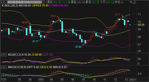 原油收报70关口,早盘阻力参考昨日高点70.6,其次关注71-71.3区域阻力,支撑关注凌晨低点69.1,下方关注68.5位置。大方向还是没有出现,高抛低吸建仓对待。技术面上4小时SAR指标高位向下发散,日内预计