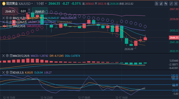 (美黄金06,4590.1,1.09%,模拟交易)技术面分析】:黄金周一在2643美元一带企稳拉升,随后黄金震荡上涨,在触及2665美元附近之后出现震荡承压,尾盘回落在触及2648美元一带之后收盘在2652美元一线。黄金日线级别收录一根阴线十字星,高低价幅度比较小,依旧处于一个承压形态中。四小时级别上看,布林带开口之后向下拐头表现走平迹象,黄金在一波连续下跌之后,