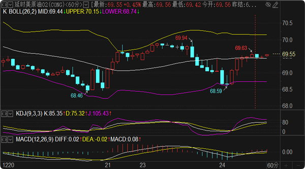 原油分析:涨跌波动很小,暂定1小时上轨70和1小时下轨68.5区间震荡整理,向上突破看71.2-71.5压制范围,向下突破看67.3-67区域形成的支撑范围。操作思路就是高沽低渣建仓对待。