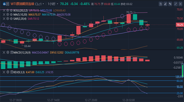 (美无铅汽油05,3.2512,-1.39%,模拟交易)多次触及前低获支撑反弹再下落,力度明显弱势前期上涨的动能。四小时级别上看,油价布林带处于宽幅震荡中,油价处于中上水平徘徊中,油价在68.4区域形成了多次徘徊考验,目前油价企稳向上考验中,上方70.9一带形成了二次遇阻迹象,进一步突破后油价有望打开上行空间。综合来看,原油下周操作思路上以回踩低多为主,反弹高空为辅,上方短期关注71.3-71.8一线阻力,下方短期关注69.3-68.8一线支撑。