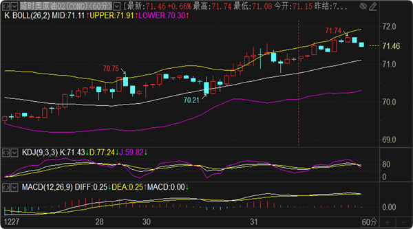 技术面来看,日线布林带上轨从昨日71.5上移到71.8,持有的空单若是扫损,预计会续涨考验前高72.8位置,向上的偏差防守压力点看周线MA30均线73.5一线。支撑方面留意4小时中轨70.5和70关口形成的支撑范围,若向下跌破70就会顺势考验4小时下轨69.3和上周低点68.5两个节点。整体来看原