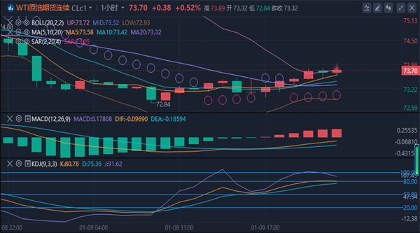 美原油日线测试下降趋势线附近之后再次回落,一方面均线偏离值较大,其次MACD指标上涨动能有所减弱,但依然在多头区间之内。关注日线支撑72美元整数关附近是否存在企稳的迹象,从而带动油价