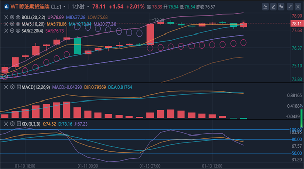 【原油技术面分析】:原油上周五出现了多头持续发散走势,在74.0区域企稳之后出现了强势上涨,最高点触及77.8美元一带徘徊。原油日线级别上看,油价