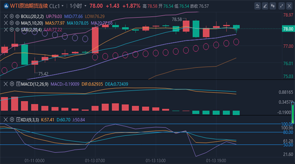 【原油技术面分析】:原油上周五出现了多头持续发散走势,在74.0区域企稳之后出现了强势上涨,最高点触及77.8美元一带徘徊。原油日线级别上看,油价