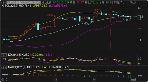今日阻力关注1小时布林带上轨79.2和1小时误差带上轨79.6形成的压力范围,更上方看80.2-80.5压制区域,若再次向上破位,只能说边走边瞧。支撑方面留意1小时下轨77.8和昨日地点77.3形成的支撑范围,若向下破位必定会去考验日线MA5均线76.5和4小时布林带中轨76.3支撑区域,更下方以日线MA60均线75.5位置定强弱。今日操作上刘铭诚建议反弹做空为主,低位做多为辅。