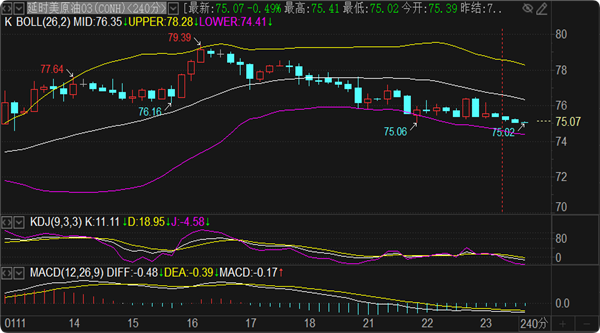 (美原油(美原油06,97.56,-0.40%,模拟交易)05,104.57,-0.42%,模拟交易)走势来看,周四晚盘和周五刘铭诚个人坚持看涨对待。技术面来看1小时和4小时周期KDJ随机指标严重超卖触及0轴,反弹随时有可能发生,日内能看到的支撑分别是74.8,74.5和74.2,只要触及下方支撑节点,我会分批做多看涨。