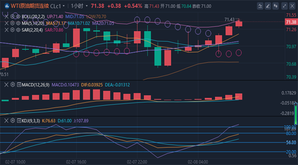 均线71.6美元附近和日线MA10均线72.5美元附近范围压制看空。下方建议参考周线SAR指标70美元附近和日线下轨69.7美元附近支撑看多。综合来看,原油今日操作思路上以反弹高空为主,回踩低多为辅,上方短期关注72.2-72.7一线阻力,下方短期关注70.0-69.5一线支撑。