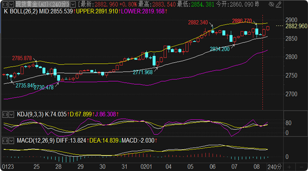 今日阻力关注2886一线,其次是2895,偏差防守看2900-2903范围。支撑方面留意1小时布林带中轨2867一线,下方留意早间回撤低点2856和1小时下轨2853形成的支撑范围,偏差防守看4小时下轨2848支撑位置。整体来看,黄金周线布林带上轨位于2855一线,周初的黄