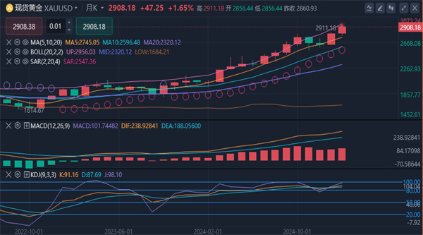 【黄金技术面分析】:今日周一黄金再一次刷新历史高点,截止到目前黄金已经是触及至2910关口上方。黄金目前在日线走势上继续维持在震荡偏强的走势中,日线