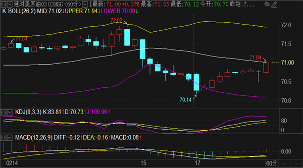今日阻力关注1小时布林带上轨71.6和4小时布林带上轨72.2两个节点,向上偏差看日线布林带中轨72.8压制点。支撑方面留意70整数关口,向下偏差看69.4和68.9两个节点。整体来看原油日