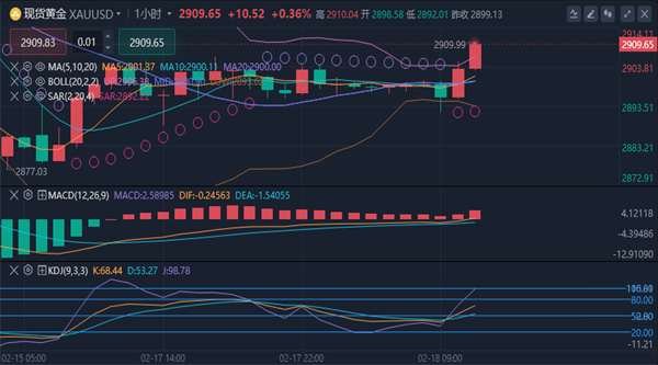 金价延续涨势,一度刷新两日高点至2908.97美元/盎司,涨幅约0.35%。