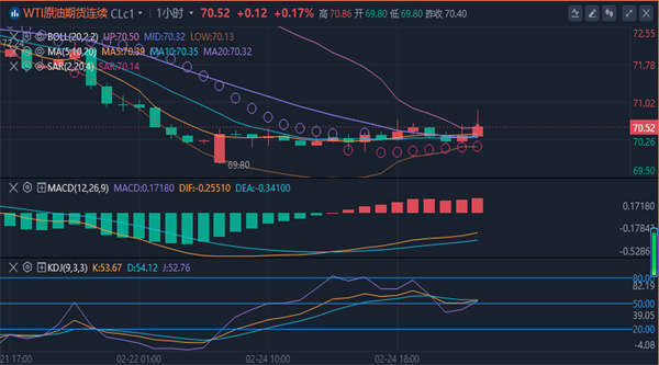 周一(2月24日)欧盘时段,轻质原油期货价格走跌,跌破关键的斐波那契61.8%支撑位,价格徘徊在70.27美元左右。当天早些时候,市场价格跌至69.80美元,跌破了上周70.12美元的低点,随后出现小幅回升后再度下跌。技术指标显示存在潜在的下行风险,原油价格仍低于50日移动平均线(71.97美元)和200日移动平均线(70.64美元)。