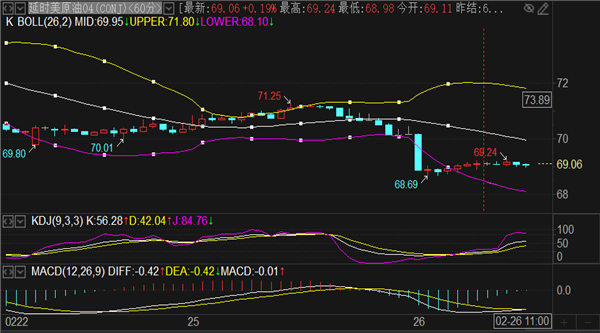 今日阻力方面关注70和70.8两个节点,更上方压力暂时不用考虑。支撑方面留意4小时下轨68.5和1小时下轨68整数关口,若再次破低只能参考前期低点66.9和66.6形成的支撑范围。日内原