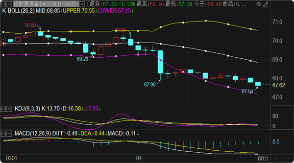 (美原油(美原油06,97.95,2.63%,模拟交易)05,105.01,3.79%,模拟交易)周一就跌破上周低点68.3位置,再次刷新低点,既然已经破低,那就还会走延续,下方的支撑只能参考周线SAR指标延伸点66.6和周线布林带下轨65.2两个节点,极限防守看月线布林带下轨63.5一线。阻力方面先看早盘高点68.4一线,其次关注4小时中轨69.2和凌晨高点69.7形成的压力范围,向上偏差看日线中轨70.6位置。整体来看原