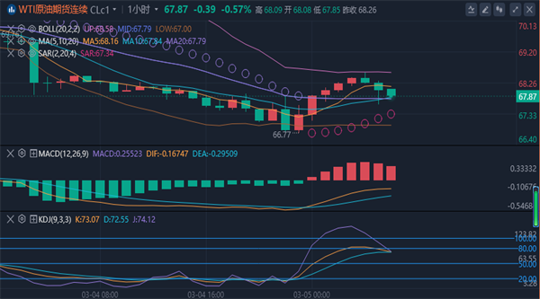 原油美原油美原油06,97.95,2.63%模拟交易05,105.01,3.79%,模拟交易)从日线图级别看,中期走势保持在宽幅上行通道内运行,油价逐步回落至通道下沿。多次出现一个交易日吞没周内前期全部涨幅的现象,空头势力更占优势。原油中期走势维持区间震荡下行,关注通道下沿对油价美无铅汽油05,3.1978,-0.85%模拟交易的支撑作用,跌破则中期跌势将开启。原油短线(1H)走势跌破区间下沿,大幅下挫创新低67.90.均线系统拐头发散向下,短线客观趋势方向确立向下。昨日下挫行情力度表现强劲,当下周内和日内的客观趋势方向一致向下。预计日内原油走势将顺势向下运行概率较大。
