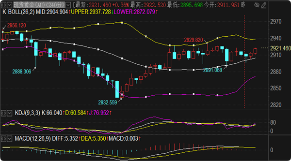 黄金实时行情分析:日内行情波动不大,先看1小时上下轨区间2920-2900区间运行,4小时布林带上下轨逐渐收口,区间关注2927-2896范围,这是能直观看到的震荡区间,晚间行情只要打破这个区间就可以看延续。今日阻力方面先看2927-30压力范围,向上突破依次关注2940和2950关口,日线上轨与前期高点同步承压2956位置,没破新高之前黄金还会回撤机会,如若向上突破则有望考验月线布林带上轨3025一线。