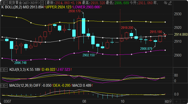 黄金实时行情分析:周一早盘并没有出现大的波动,行情走势较为平稳,那就可以套用1小时布林带上下轨2923-2903区间震荡整理对待,向上偏差看2930压制点,向下偏差看2891支撑位。周初没有重要数据,这是能看到的常规震荡范围,