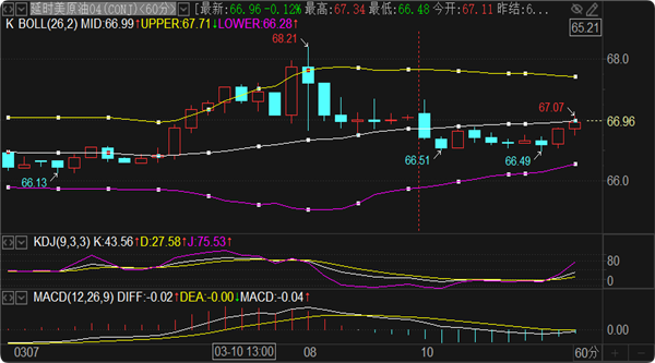 今日阻力方面关注1小时上轨67.7和上周五反弹高点68.1形成的压力范围,向上偏差看周线MA5均线68.9和日线布林带中轨69.9两个节点。支撑方面留意1小时下轨66.2和日线布林带下轨65.6形成的支撑范围,向下偏差看上周低点65.1和周线布林带下轨64.7两个节点。整体来看周初思路以上周低点看涨对待,若反弹触及周线均线压力点或者70关口同样能做空,对于欧美盘操作上刘铭诚建议回撤做多为主,高位做空为辅。