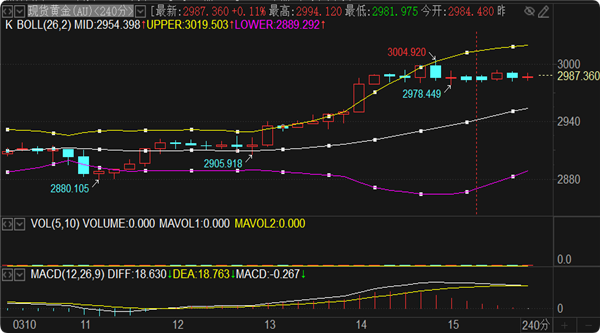 黄金实时行情分析:周一没什么重要数据,预计就是个震荡走势。早盘高点2994承压转跌,日线布林带上轨位于2998一线,4小时图形SAR指标完成顶底转换出现在上周高点3004位置,这是目前能看到的三个压力节点,向上偏差看周线布林带上轨3018一线,没突破3004之前,更上方的阻力节点都不需要考虑。支撑方面留意上周五回撤低点2978位置,下方看日线MA5