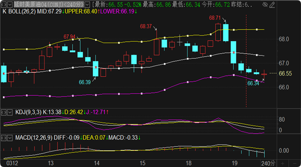 (美原油(美原油06,96.22,0.82%,模拟交易)05,103.02,1.82%,模拟交易)触及68.6转跌,行情走势完全符合预期,现在回落至66.6一线,那么也快要到了低位做多的回合了。盘面上来看1小时布林带中轨和4小时布林带中轨重合承压67.4一线,基本上和凌晨高点一致,这里就是今日的强弱转换节点,向上突破看4小时布林带上轨68.3一线,同时周线MA5