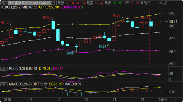 支撑方面以4小时布林带中轨粘合4小时SAR指标延伸点位置67.5来判断强弱,如若向下破位,油价