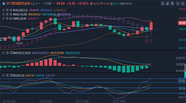 原油期货价格下滑,交投于69.47美元附近,略低于其枢轴点69.54,表明行情略微偏弱。