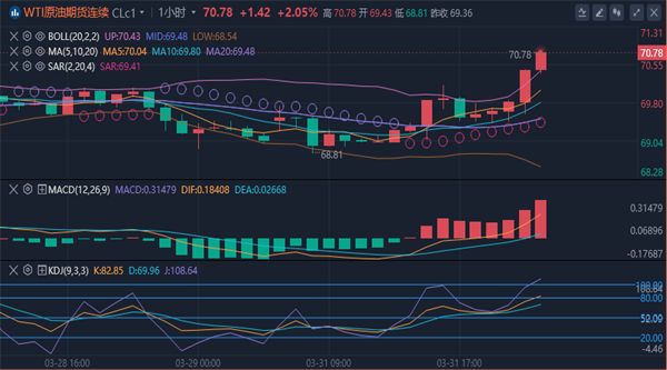 原油期货日内呈现波动状态,价格在欧市早盘大幅上扬,突破70.00整数关口后有所回落,但仍保持在相对高位震荡。
