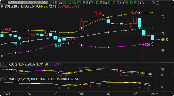 油价格再次跌破70关口,昨夜70挂多单早盘反弹到69.9提示离场,行情没的说,调整还将继续。盘面上来看4月份月K线再次收录长上影阴K线,周线同步转为长上影阴线控盘,日K线更是实体大阴下探,同时日线SAR指标完成顶底转换高位承压向下发散,这都是利空信号,周初的调整已经出现方向,那么现在维持高空对待更稳稳妥。