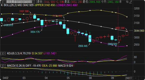 (美黄金06,4550.9,0.65%,模拟交易)实时行情分析:周三早盘低点刷新给到2956一线,现在却又反弹到3052,亚盘的反弹空间达到96个点。随着关税从45%上涨到104%,这个影响还会加剧。盘面上来看周二高点2023已经破位,那么欧盘黄金就还会有爬高的空间,短期阻力只能参考周一高点3055压力点来判断晚间的涨跌,更上方看4小时MA60