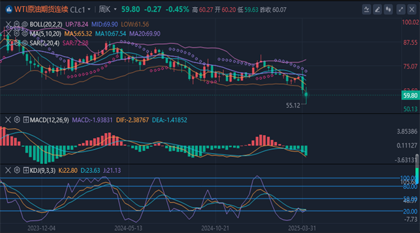 均线系统拐头发散向下,中期客观趋势方向向下。由于关税引发的下行,关注其连续性,进一步确定中期下行将跌向55甚至50位置。原油