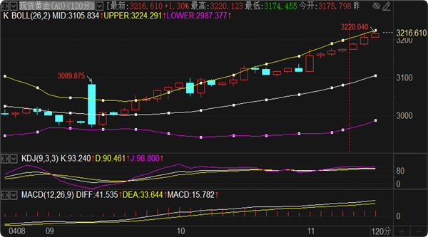 (美黄金06,4579.7,1.29%,模拟交易)直线冲高,最高触及3220美元/盎司,再度刷新历史高点,