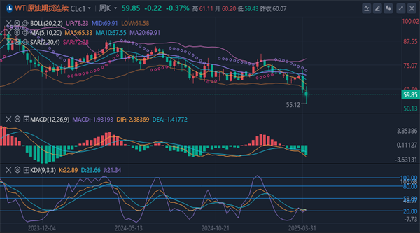 油价触及60附近。均线系统拐头发散向下,中期客观趋势方向向下。由于关税引发的下行,关注其连续性,进一步确定中期下行将跌向55甚至50位置。原油