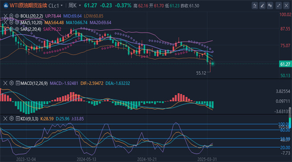 均线系统拐头发散向下,中期客观趋势方向向下。由于关税引发的下行,关注其连续性,进一步确定中期下行将跌向55甚至50位置。原油短线(1H)走势小幅回落,油价