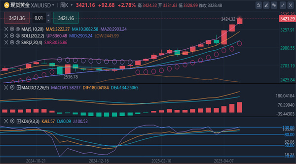 (沪金2604,1014.36,0.33%,模拟交易)自4月12日以来持续上行,突破了过去一年形成的上升通道上轨,显示出强劲的上涨动能。现货黄金在周一(4月21日)强势站上3400美元/盎司,盘中一度触及3407.73美元/盎司的历史新高。上升通道的上轨由2024年4月12日高点2431美元/盎司绘制,下轨则连接2024年2月15日低点1990.30美元/盎司。此番突破表明市场多头力量占据主导,短期内延续上行趋势的可能性较高。关键技术指标进一步印证了金价的强势。短期至长期的指数移动平