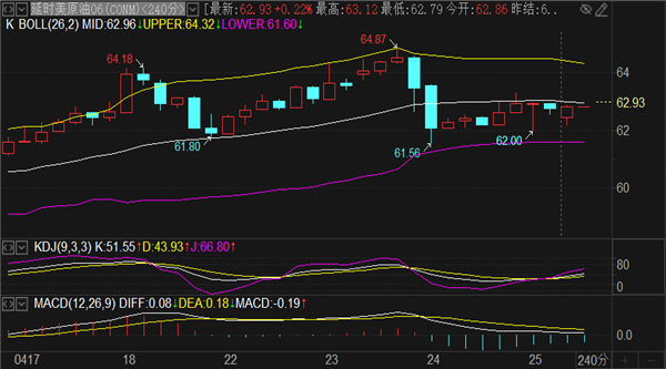 (美原油(美原油06,95.43,-0.01%,模拟交易)05,101.80,0.61%,模拟交易)的震荡区间基本上没有变化,日内还是看63.2压力点来判断日内走势强弱,上方的阻力同样是63.8和64.3两个节点,偏向看本周高点64.8-65.2形成的压制范围。支撑方面先看4小时平行通道下轨从61.1上移到61.9位置,4小时布林带下轨位于61.6,本周低点61.5定涨跌,向下破位看60整数关口,日线图形周期趋势看涨支撑点在59.1一线,再次向下破位则极大概率会加速下跌,更下方参考58.2和56.8两个节点。整体来看原油大周期下跌趋势并没有发生改变,多次提及的65.2支撑转阻力节点并没有突破,操作上刘铭诚建议高位做空为主,低位做多为辅。