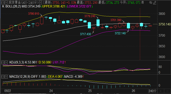 支撑方面留意1小时下轨3728一线,4小时布林带下轨支撑点3720和回撤低点3717算是最后的防守范围,若向下破位将直接试探3702和1小时通道下轨3697形成的支撑区域。日内的温和震荡区间关注3754-3728,