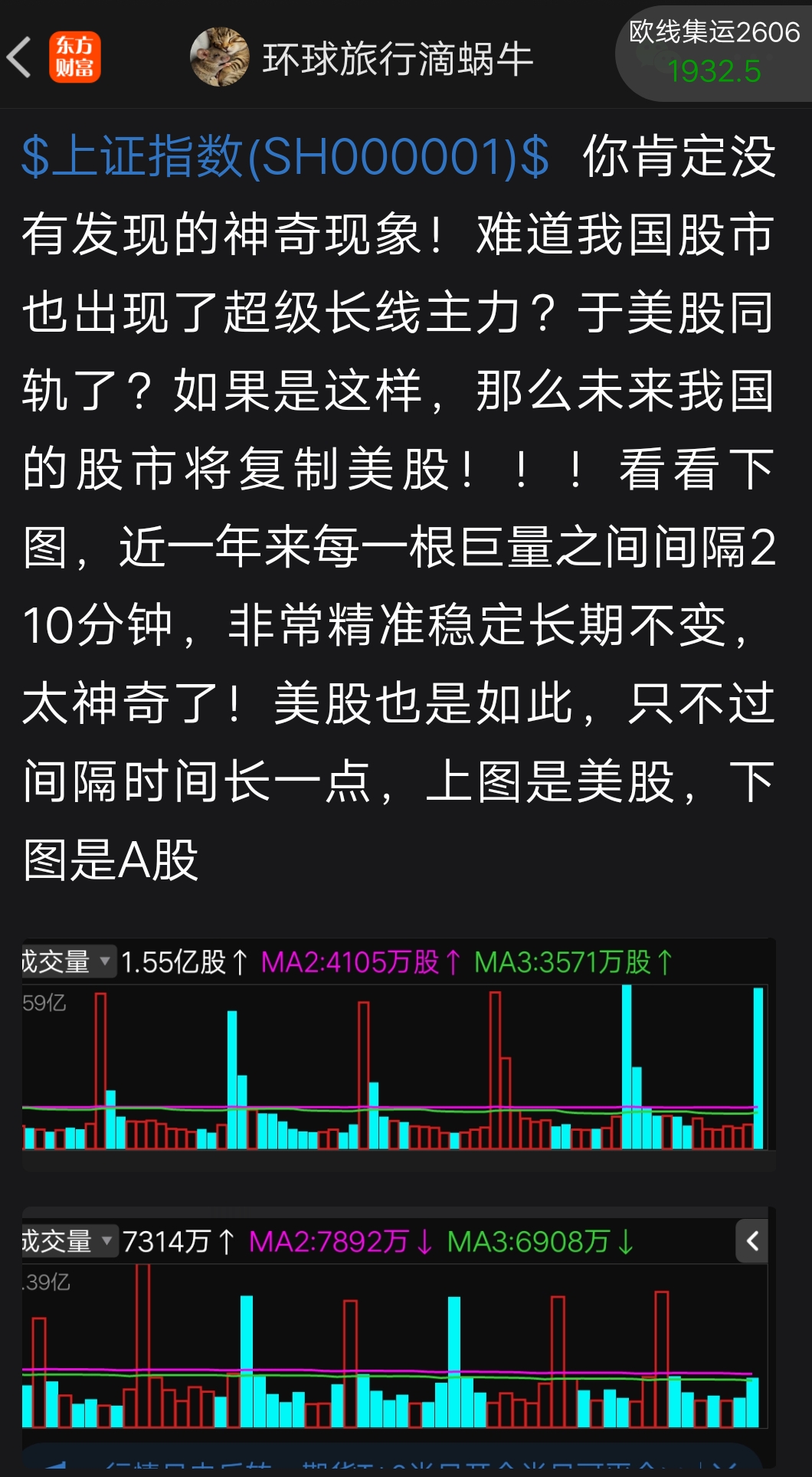你是来搞笑的吧?A股每天都是开盘后一段时间成交量最大,因为国内散户和机构大多喜欢开盘交易,5、15、30、60分钟K线固定4小时左右大幅放量;美股每天都是收盘前几分钟成交量最大,因为美股的机 ...