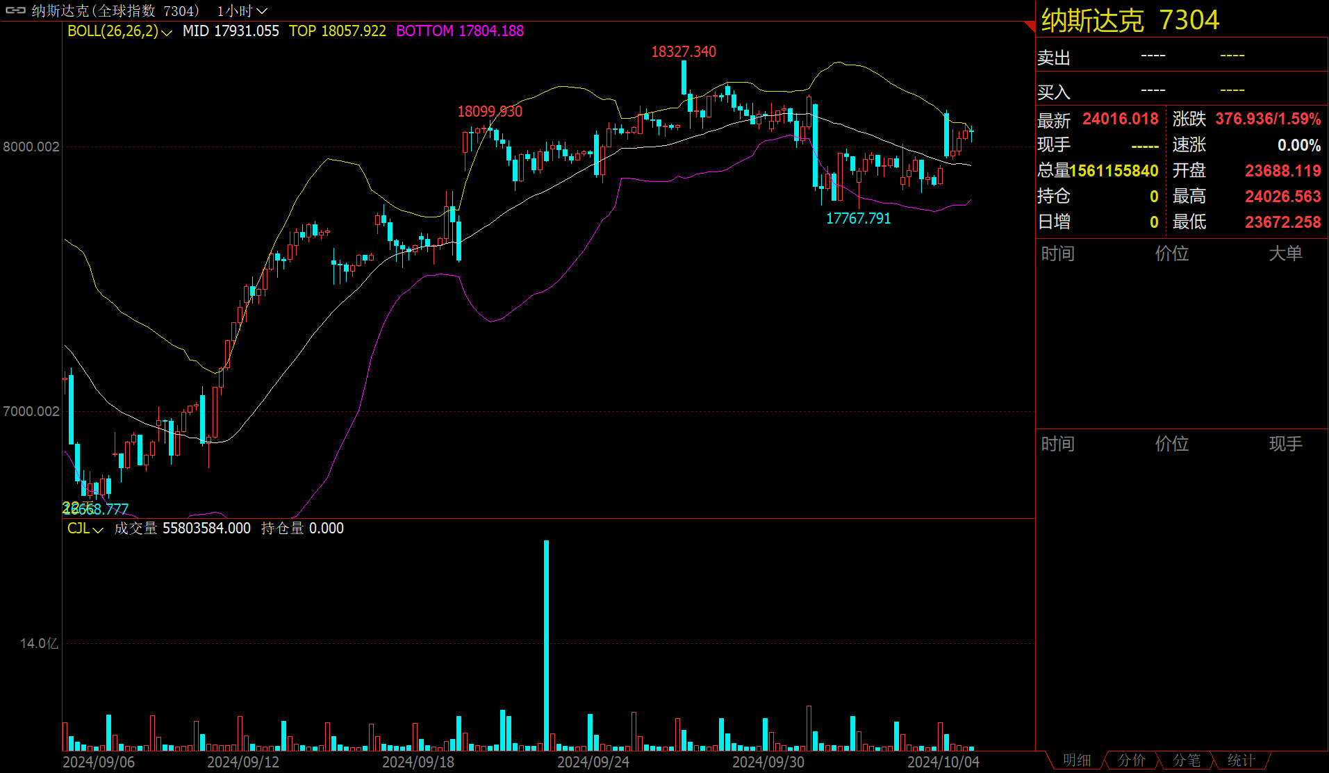 既然有人不会看K线,那就帮忙截个图吧,时间2024年9月24日前后一段时间,都是60分钟K线,注意看看多久放量一次?是不是和A股美股每日交易时长一致?