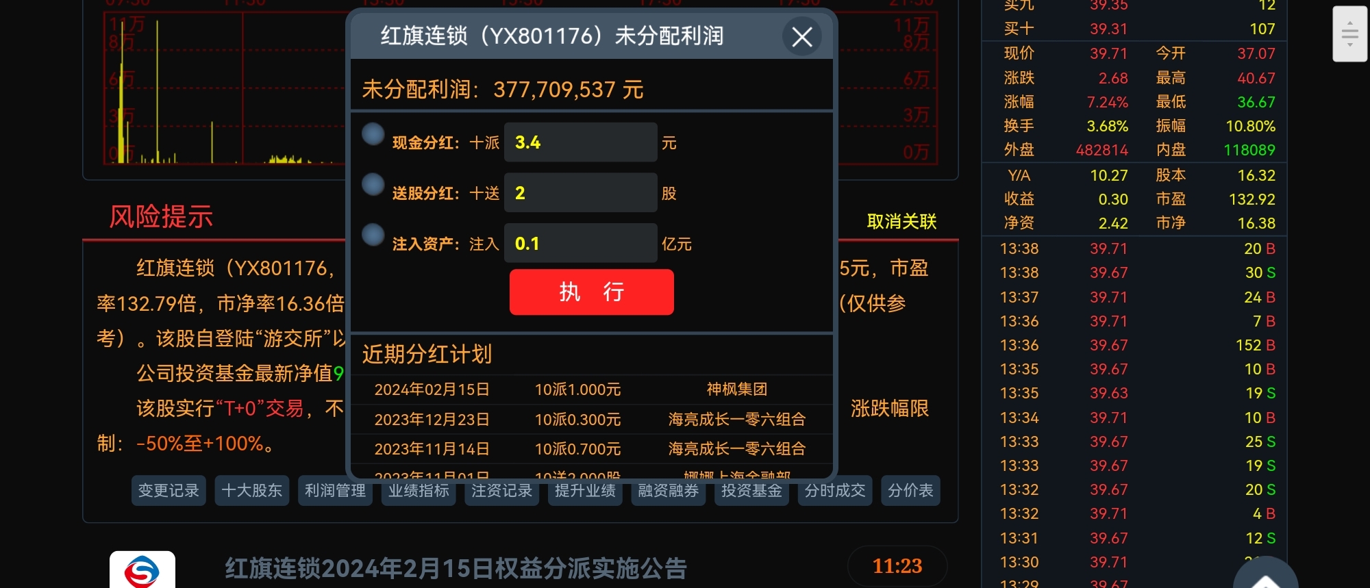 除公司自行发放的A股实盘现金红利的股东外,公司其他股东模拟股市现金分红,由红旗连锁YX801176实控人:神枫集团,在分配当日收盘前执行未分配利润现金分红。