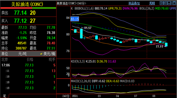 (美原油(美原油04,62.81,-0.77%,模拟交易)03,63.00,-0.79%,模拟交易)欧盘破位77.5低点,实时现报价77.2一线,刘铭诚这边也是给出77.2轻仓追空看跌,思路很简单,欧盘破位低点,今天从高点78.3算下来才跌了11个点,既然破位就顺势干空,再跌10个点+也是常态。今日的阻力很明确,依次关注今日高点78.3,凌晨反弹高点79.1,防守阻力范围看80-80.5区域就行,强弱转换节点还是81.5位置。支撑方面线看76.5和76形成的支撑区域,下破空间无限,依次参考75-74整数支撑节点。凌晨API库存数据大幅度利空,这对晚间的EIA数据也会有影响,今日思路高空看新低。原油策略:反弹触及77.8做空,78.3补仓空单,止损78.8,目标77-76,下破持有。