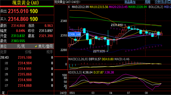 (美黄金04,5043.7,1.10%,模拟交易)涨跌波动维持在小时线上下轨区间内运行,上轨2319,下轨2305,