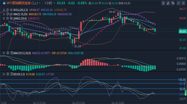 油价运行在布林带上轨附近,KDJ金叉后向上发散运行,整体走势偏强。目前中东局势的不稳定性对原油起着支撑作用,欧佩克+最近的减产行动导致市场供应更加紧张,原油暂时很难跌下去,预计还将进一步上涨,因此本周操作上顺势做多为主。 综合来看,原油周一操作思路上建议以回踩低多为主,反弹高空为辅,上方短期关注85.0-85.5一线阻力,下方短期关注82.5-82.0一线支撑。