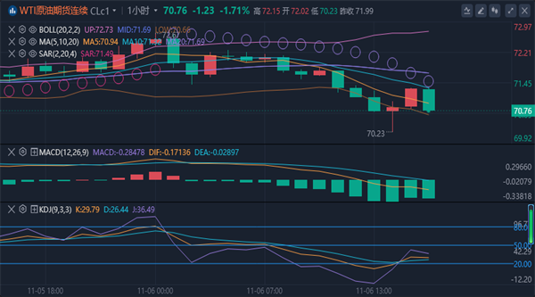均线压力点在72.7,月线MA5均线压制点在73关口,周初并不看好单边上涨,欧美盘触及阻力范围正常做空。支撑方面留意早间低点70.3位置,4小时中轨和MA60均线粘合支撑点在69.7位置,更下方支撑参考69-68.5区域。短期趋势向上移动,但是上方阻力位没有突破,预期先涨后跌走势。综合来看,原油今日操作思路上以回踩低多为主,反弹高空为辅,上方短期关注72.0-72.5一线阻力,下方短期关注69.8-69.3一线支撑。