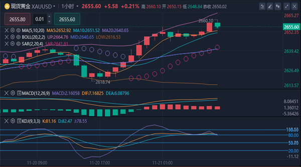 【黄金技术面分析】:昨日黄金市场延续拉升过程,早盘开盘在2632.2美元/盎司,后行情先拉升给出2642美元/盎司,后行情快速回落,日线最低给到了2618.5美元/盎司,后行情强势拉升,日线最高触及到了2655.3美元/盎司,后行情受到本轮下降压力线压力整理,日线最终收线在了2650.2美元/盎司,后日线以一根下影线很长的大阳线收线,而这样的形态收尾后今日的行情延续看多。四小时级别上看,黄金在2536美元之后出现了多头延续上涨,在经过几经反转后,黄金最高点触及2656美元附近遇阻,运行了一个漂亮的五浪上涨形态,上方强弱分界线在2660一带,预期金价