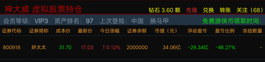 本人在好太太成本约为32元,应广大玩家投票结果显示,暂无退市风险,锁定持仓200万手也回应广大玩家,而且好太太该股业绩良好,实体公司短期无负债,表明业绩持续看好,望所有股东都能从业绩的成长获的收益,目前游侠给出退市价为15.8元,业绩增长,价格自然水涨船高,2019年望所有支持我的朋友以及不支持我的朋友都能从游侠股市有所收益,最后奉劝各位玩家,珍爱现在,远离期货。同时本人也尽量做到不发贴或者少发帖,尽量做成死人,以满足某些利益集团要求。祝大家2019年一路收益一路长红!!!