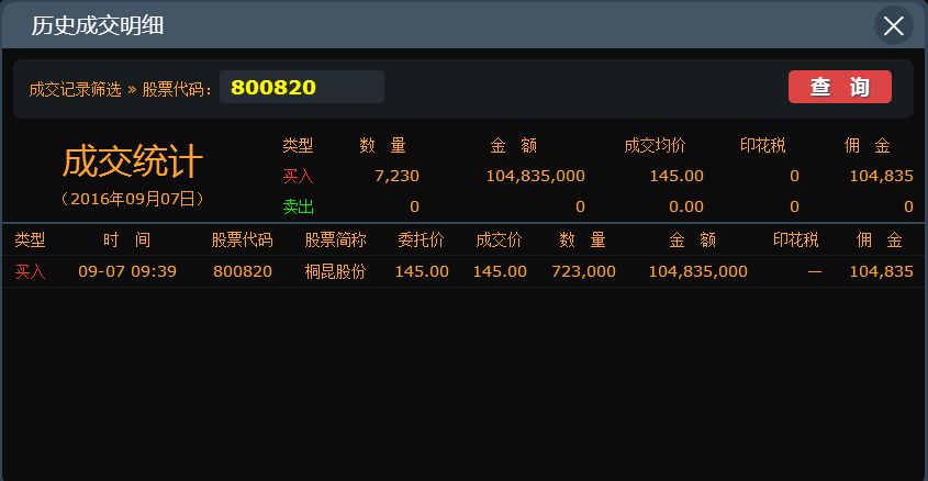 买入    09-07 09:39    800820    桐昆股份    145.00    145.00    723,000    104,835,000    —    104,835
