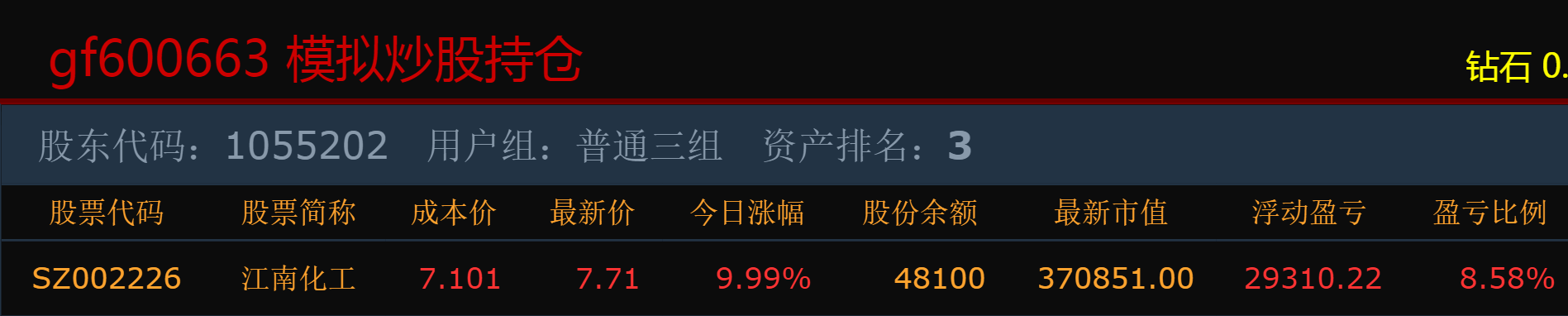 模拟炒股普通三组里满仓停牌的江南化工复牌涨停,也让自己的总市值排名再次回到第三名,如果下周一继续涨停报收,则排名将升为第二名,则当日将给电梯注入2亿作为股东