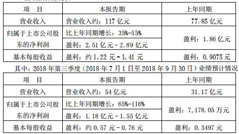 2018年前三季度营业收入约:117亿元,比上年同期增长:35%-55% ;