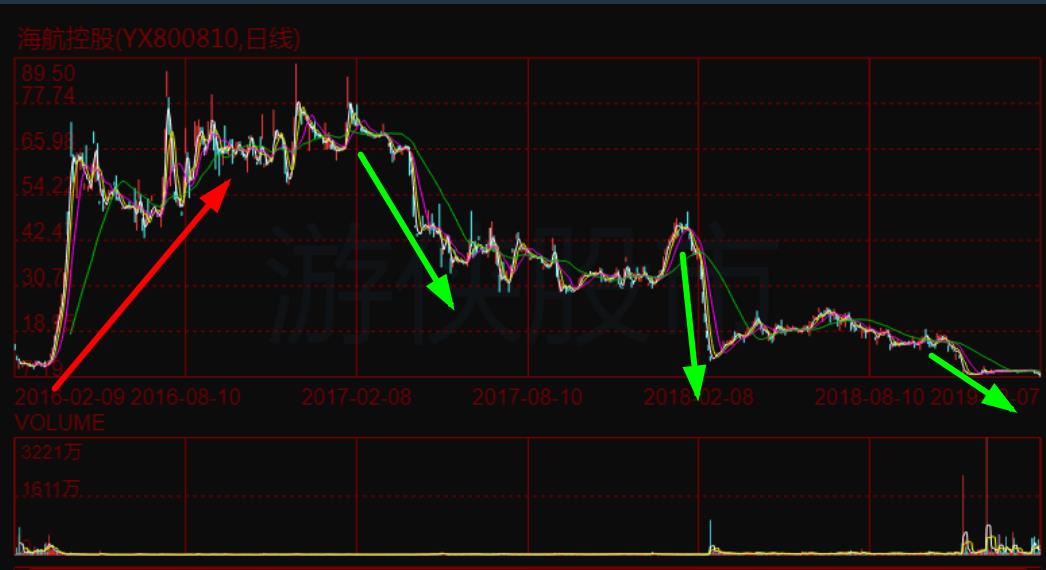 海航控股原名海南航空,申购那会曾经引起一波轰动,因为发行人是彩云菲月,是游侠的前首富,进来第一天就先把世贸封了个涨停板,后面还是大涨,因为世贸股份的崛起,导致后面彩云菲月概念股的热潮,海航上市后,第一天在满怀希望中,一片看多声上市,果不其然,甚至有人认为海航会和世贸一样,尾盘封涨停,于是想赚快钱的人满怀希望的等待,终于海航上市了,开盘就溢价4倍,但是开盘后,由于涨幅过大,以及卖盘踊跃,导致股价全天高开低走,最终收涨3.5倍,第一天满怀希望的人进入后,股价连续4个跌停板,导致第一批追高买入的人重套,许多人怨声不断,在大家都对海航失去希望的时候,突然出现众多资金,将海航的股价推动,风信子概念股随至高潮,金宇集团、世贸股份分别站上100、1000元大关,所有彩云菲月概念股以及风信子概念股被爆炒,海航也不例外,海南航空由于股价低的优势,被重点炒作,出现了30天21个涨停板的奇迹,创造了游侠涨幅榜的惊人之作,各种光环笼罩在海南航空,众多游侠大佬纷纷看好,由于海航市值较大,涨幅较高,引发了游侠融券大战,当然,最后胜利的还是多方,因为各大股东实力雄厚,比如说彩云菲月、风信子2015、万无一失等众多大佬都参与过此股,导致股价连续被爆炒到86元,涨幅整整10倍之多!之后海航一直作为大盘股,控制游侠期货的好帮手,导致海航股价仍然在60-80元区间震荡,但是好景不长,因为游指期货交易冷清,管理人员宣布取消期货,这就导致了海航虚高市值,并且成长性不高,股价受到了冲击,但是由于大部分股东都没减持,股价仍然在高位震荡,17年4月份,海航终于塌了,先是受到万无一失三个月没有上线,系统自动抛出影响,后面在4个跌停板之后上线,危机解除,后面股价又被炒高至40元,但是由于新一波的平仓危机,导致海航股价直接跌破前期低点,到达了24元的低点,当天跌停板成交量明显放大,之后,股价仍然持续上涨,最高价48元,涨幅近一倍,后面经过小幅调整后,平仓危机又出现了,这次的平仓危机导致海航股价,直接从40元跌到了11元,万无一失已经全部减持完毕了,股价跌到11元后,又是一波基金炒作,将股价炒到了24元,之后最后一波平仓危机出现,股价直接跌到8元,经过几年的轮回,海航又回到了原点,但是由于业绩亏损,可能还有一波业绩危机导致海航股价大幅下跌,作为历史上的大盘股,海航究竟将何去何从呢?