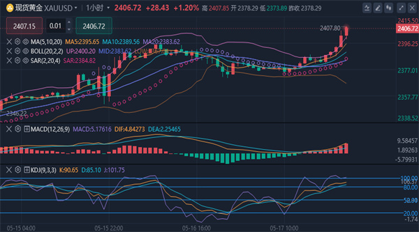 【黄金技术面分析】:黄金昨天没有能够突破2400,黄金冲高回落,上涨走势有所放缓,要关注下有没有调整结束之后的二次拉升走势,日线关注下2360一带的支撑位。黄金日线小阴线回撤,没能延续前一日的强势收高,只是在亚盘惯性探高后承压回落,最高2397.美元低位反弹,限制了短期走高动能。黄金日线图来看,日K之中,随机指标暂时还是钝化金叉的向上信号;指标是金叉;但是是日K的上轨道还在压制,2400附近的压制还在;所以,这里很难说会一口气破位向上; 4小时之中,随机指标目前是死叉向下,偏空信号;但是高位抗跌;顶底转换支撑给到了2370附近;中轴的支撑位置2363附近的位置;考虑指标是死叉的,价格形成了抗跌的状态;这里偏向时间换空间的一个模式;